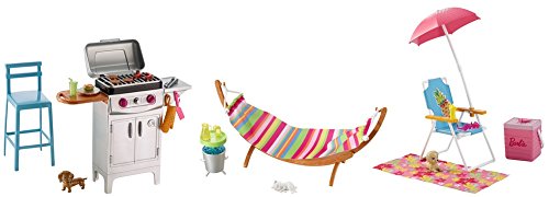 Soak up the sun with this Barbie collection of outdoor furniture plus pet packs. They help set the scene for a perfect day with fun outdoor settings like a hammock, barbeque or a beach picnic and a pet friend to help enjoy the day (doll sold separately). Arrange and rearrange the pieces to tell fun stories. Each set includes traditional furniture pieces (like a hammock and table, grill and chair or umbrella beach chair and cooler), delicious snacks and cool accessories. The included pets are adorable, with a kitten or a puppy ready for pet play. Open the door to imagination with these play sets that let kids explore outdoor fun. Add variety to Barbie doll’s play spaces by collecting all of her outdoor furnishings and accessories. Each set includes outdoor furniture pieces, food items, themed accessories and an adorable pet friend, doll not included. Each sold separately, subject to availability. Colours and decorations may vary.