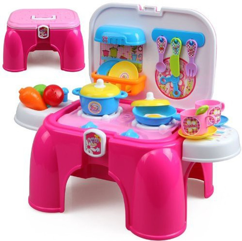 Lavidi bring a upgraded Portable kitchen set for your kids, your Kids Can Role Play and Imitate the Real Life Kitchen Cooking Scenario with This Kitchen Set.Cook Top with Rotating Knobs that Flash with Colorful Lights and Realistic Cooking Sounds, Frying Pans, Plastic Fruits and Vegetables, Toy Clock with Movable Hands, Utensils and Many More Parts, Store All the Toy Parts in a Storage Chair That will transforms into a Sitting Chair and That Can Be Carried by the Handle on Top, It can be gifted on any occasion like birthday etc..