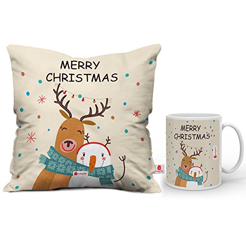 You can click on the this link to go to Amazon and get this awesome deal to buy Indibni Christmas Gifts Merry Christmas Quote Snowman and Reindeer Hug Showing The Festival Fun And Frolic White Coffee Mug and Cushion Cover 12x12 with Filler - Gift for Birthday, Anniversary, Home Decor at just INR 549 with 46% .